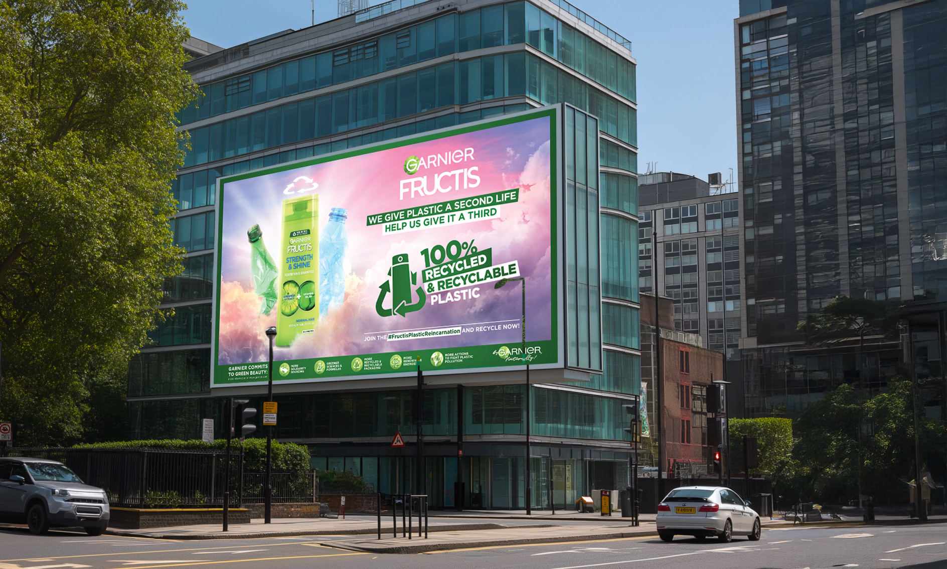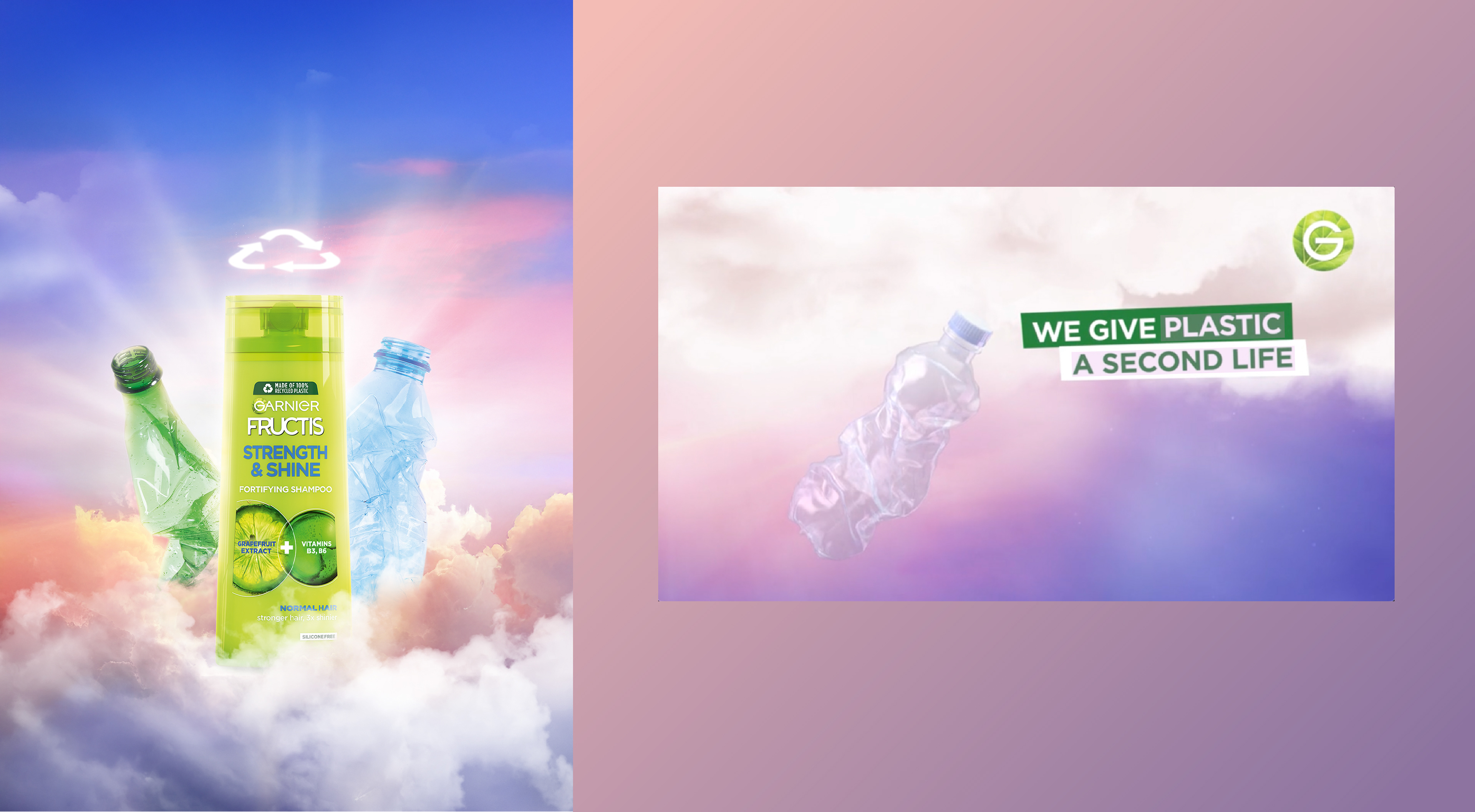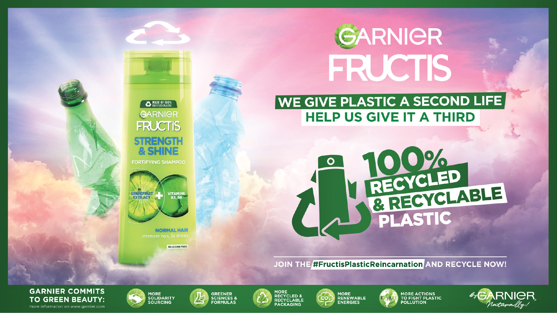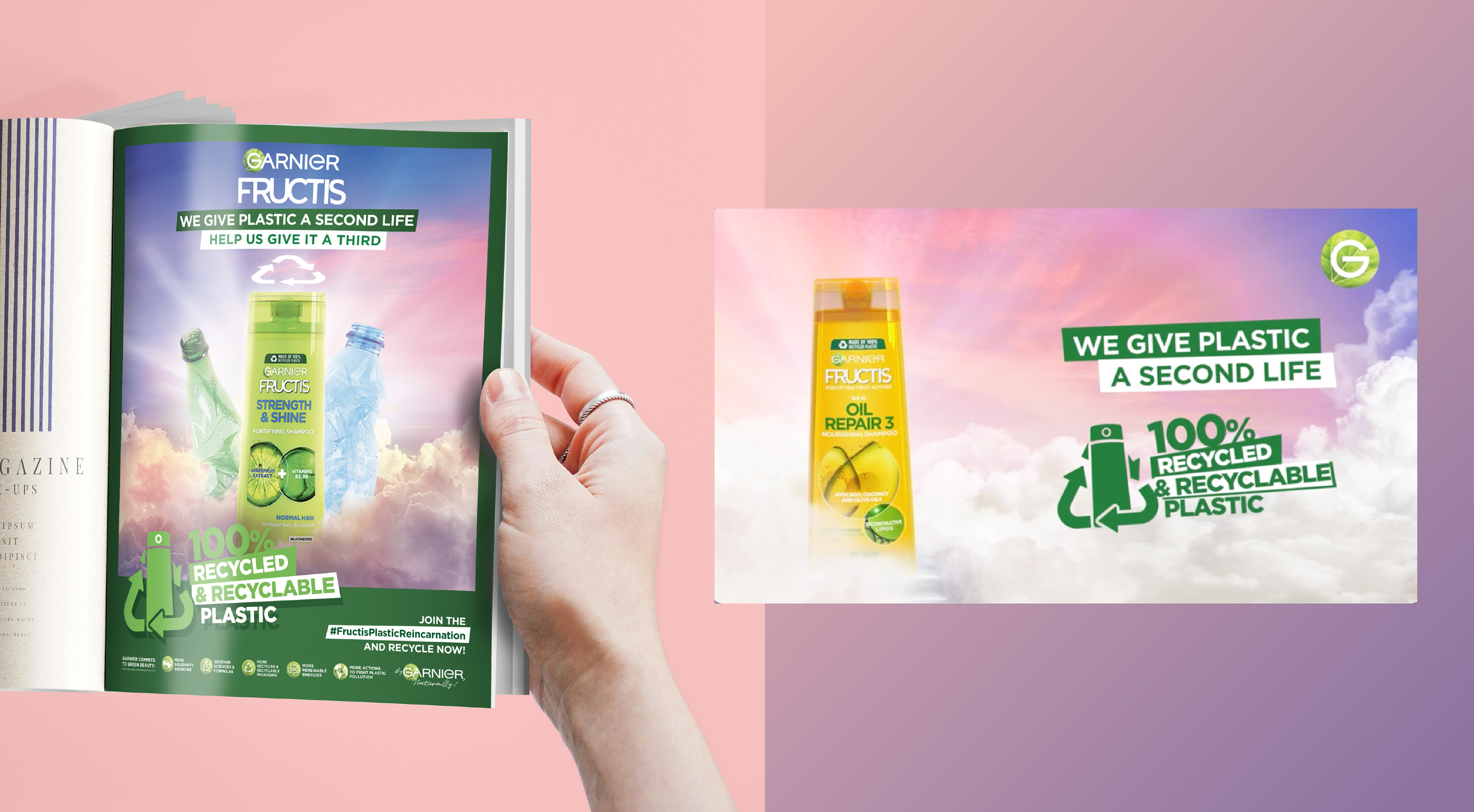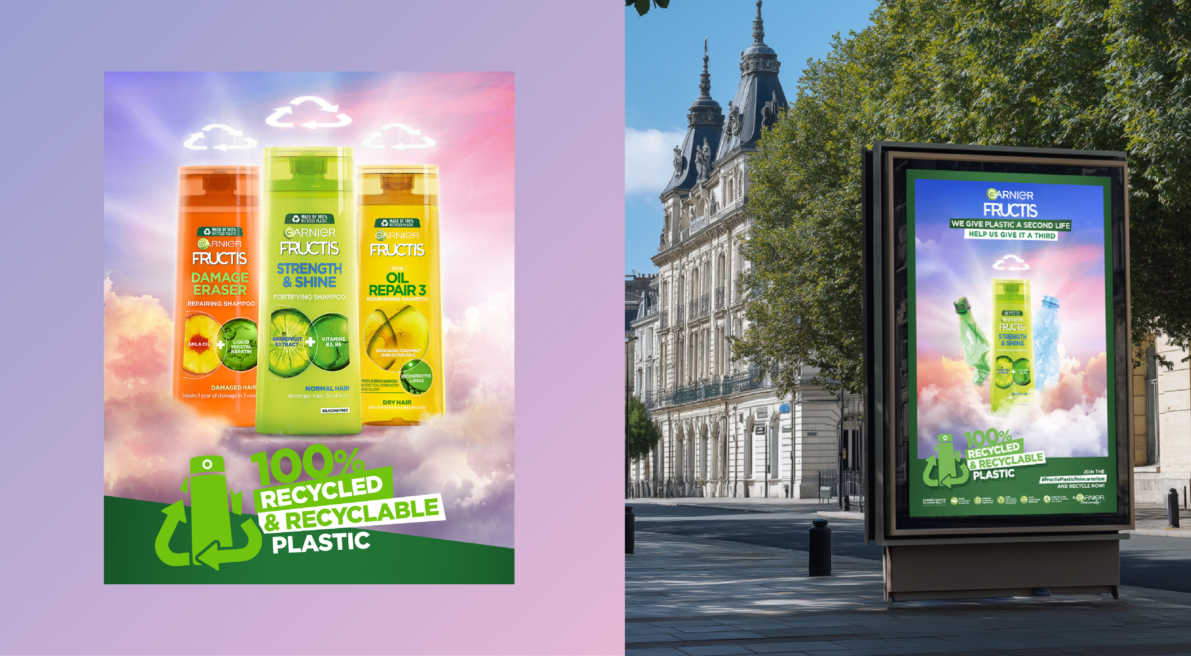 Campaign to introduce the new "Made of 100% recycled & recyclable plastic" for Fructis.
